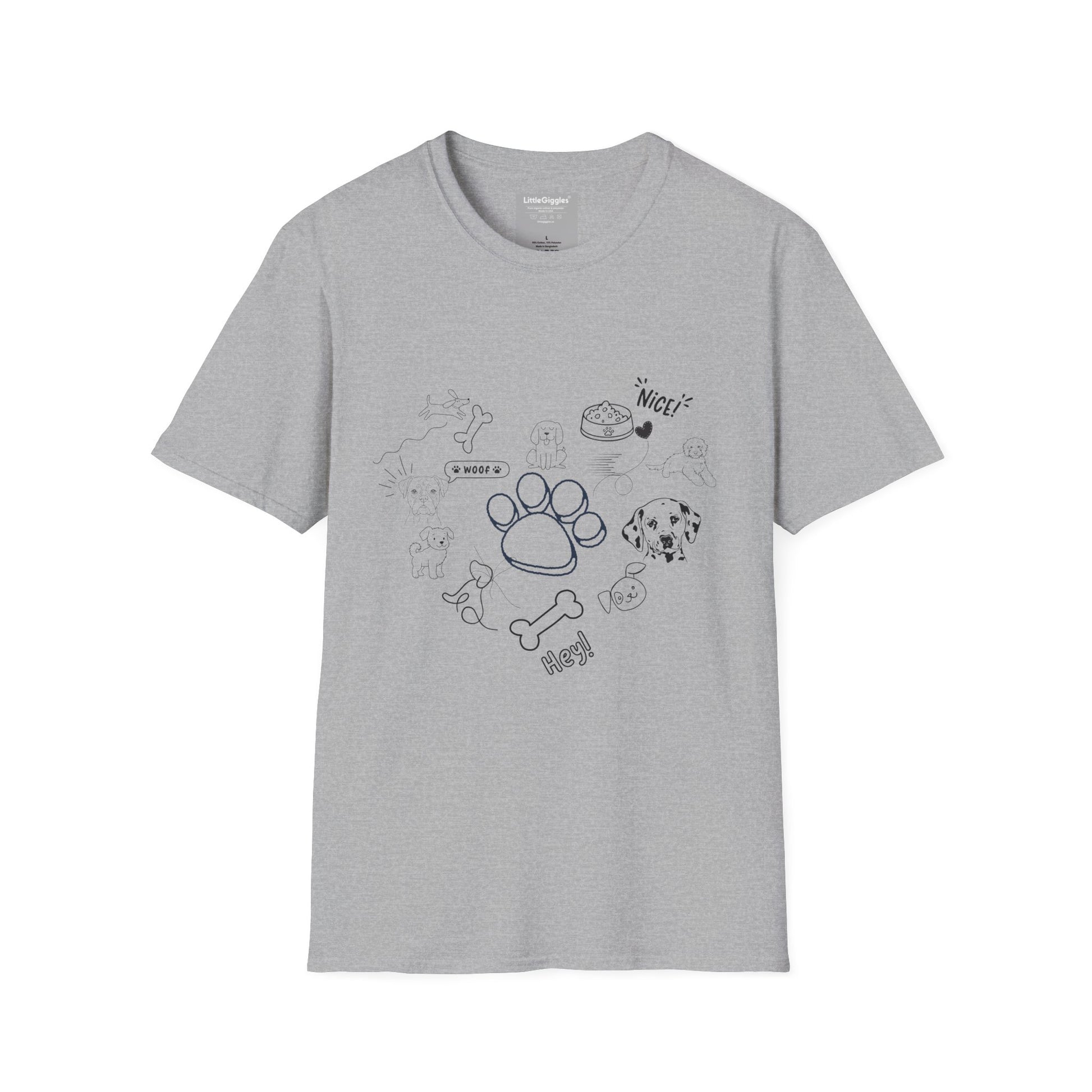 Introducing a charming Unisex Softstyle T-Shirt that brings a playful vibe to your wardrobe. Adorned with delightful illustrations of various dogs, this shirt captures a sense of joy and whimsy. Perfect for animal lovers, casual outings, or relaxed gatherings, it seamlessly fits into everyday life.