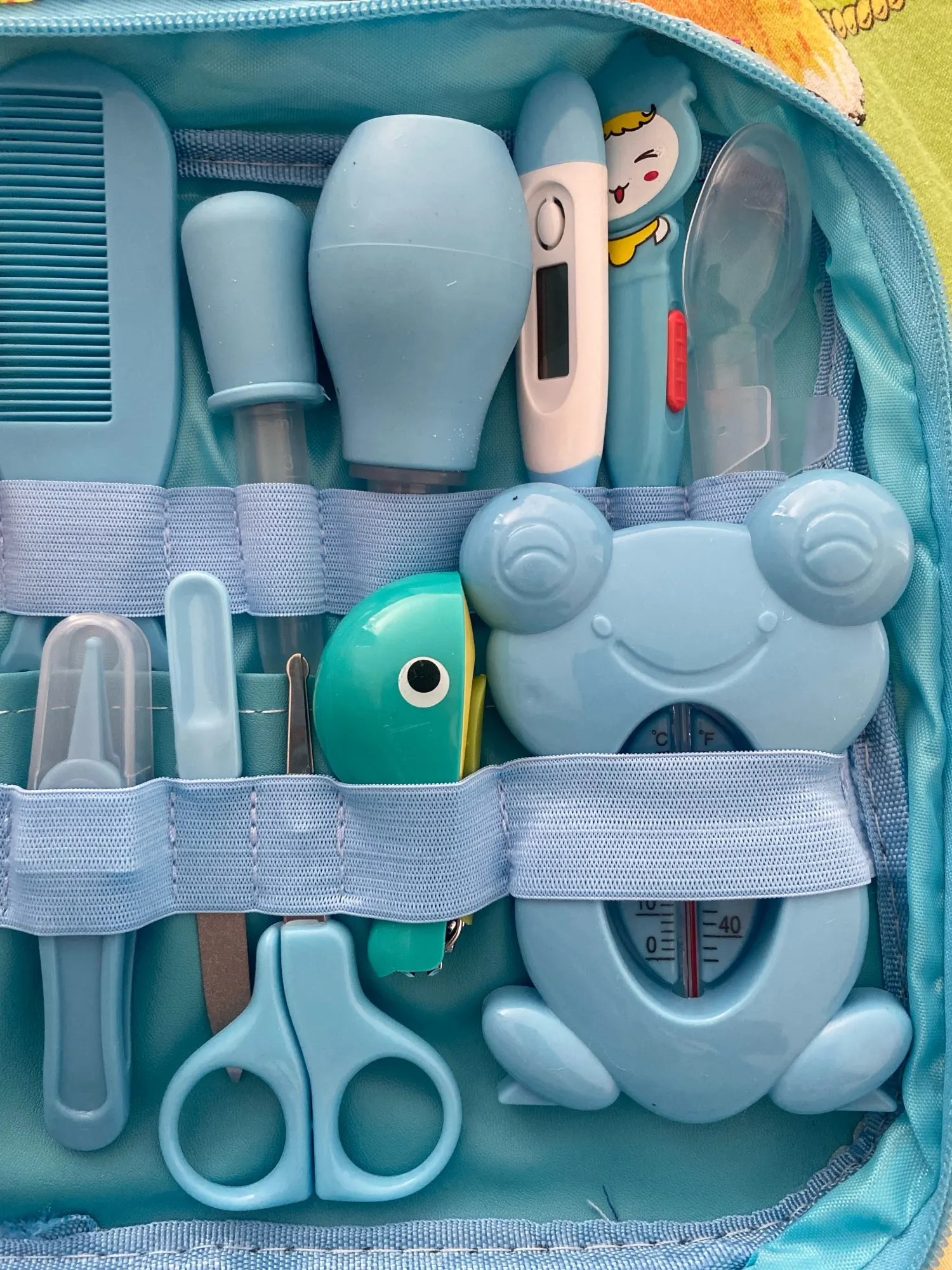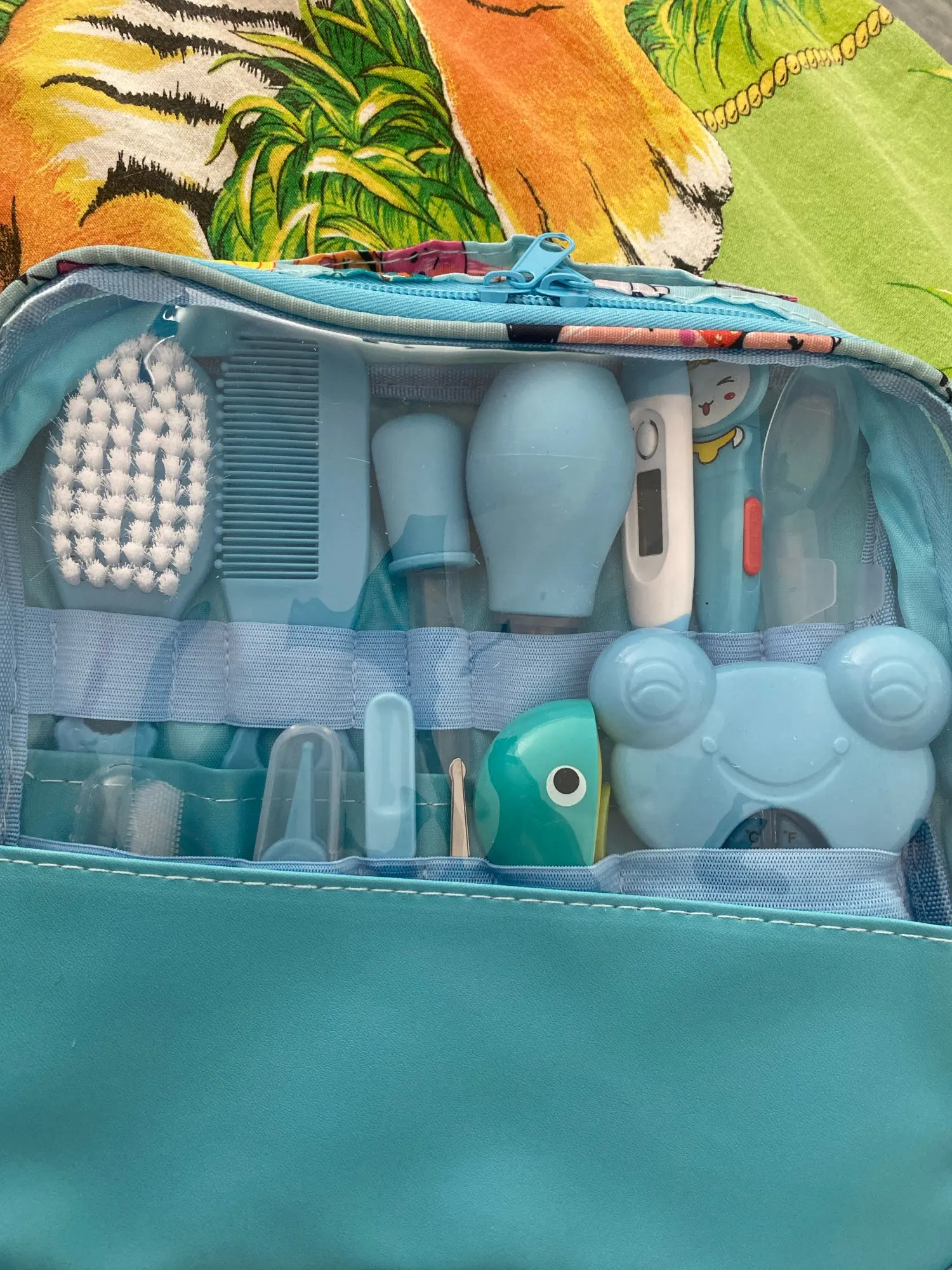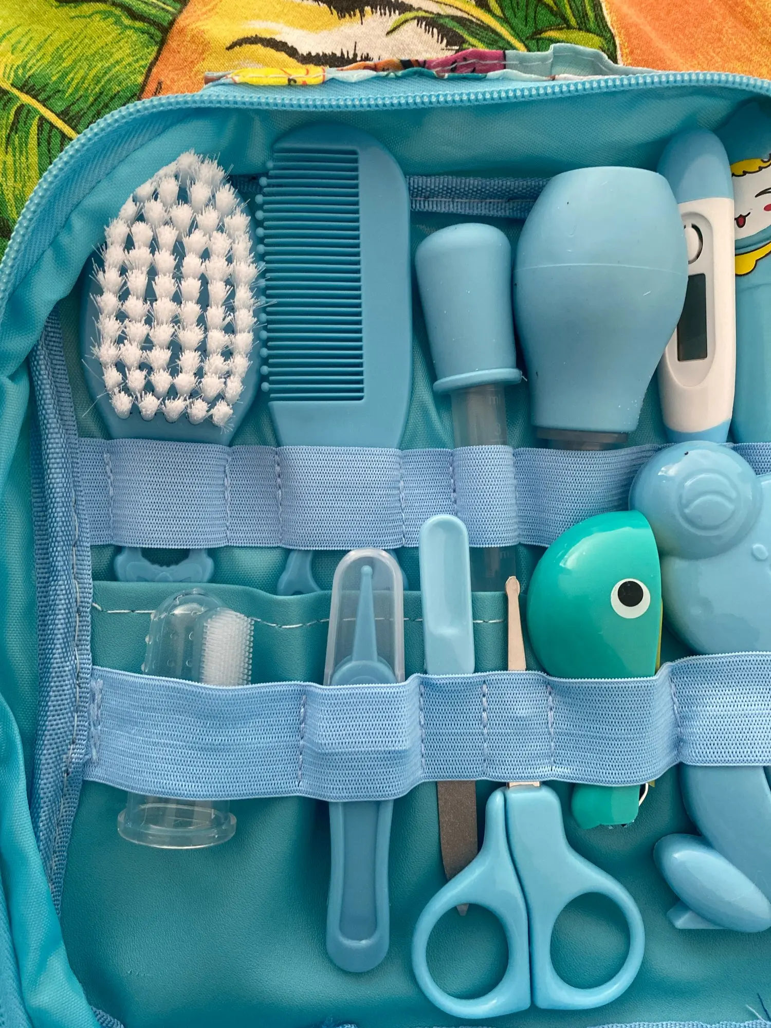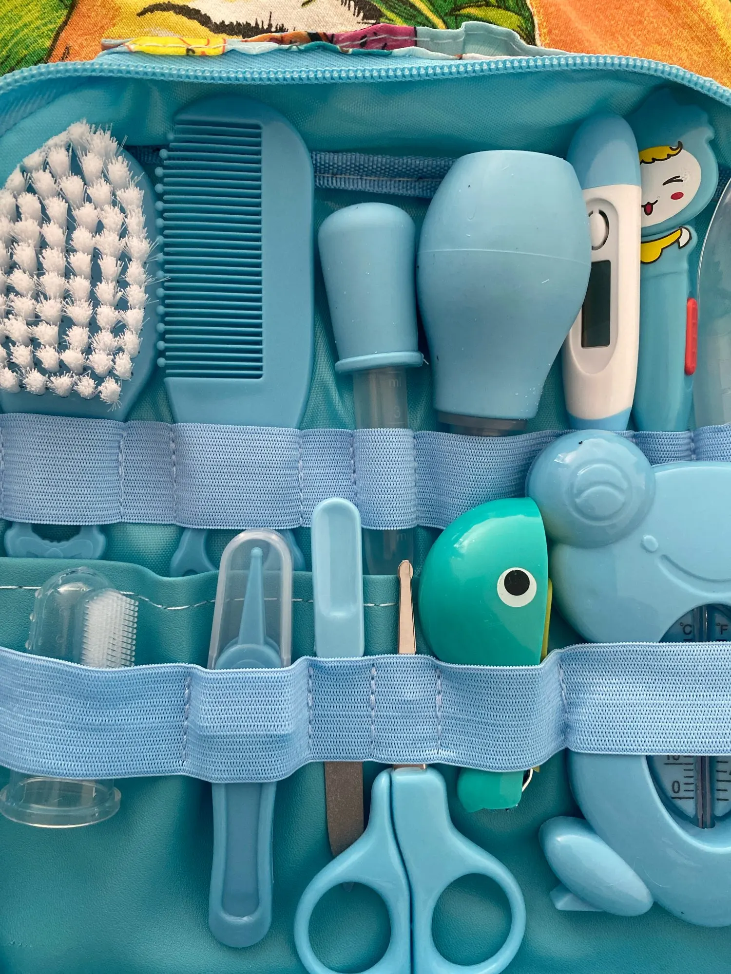 1 Nasal aspirator with small, flexible tip for baby's comfort. 2 Comfortable silicone finger toothbrushes, clean baby's teeth and tongue. The illuminated LED ear spoon can easily clean and watch the baby's little ears. 4 With the scale on the medicinal feeding spoon and dropper, it is more accurate and easy to feed a baby. 5 scissors with round blades will not poke babies.
