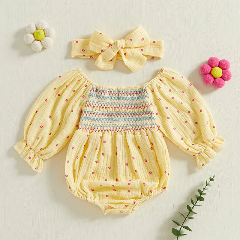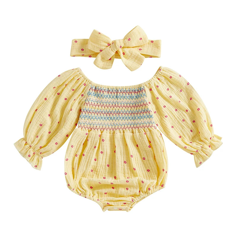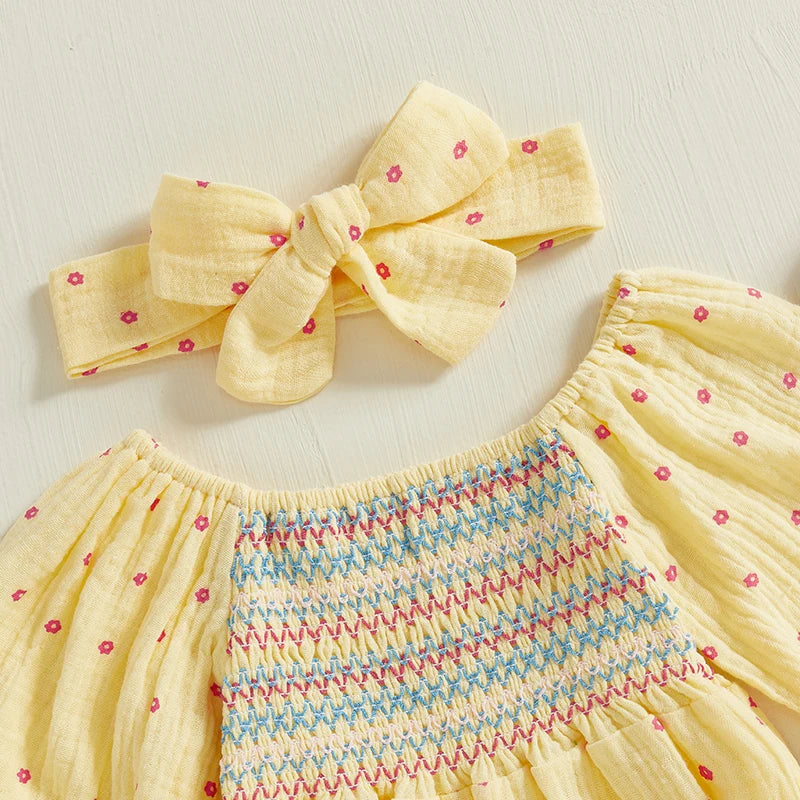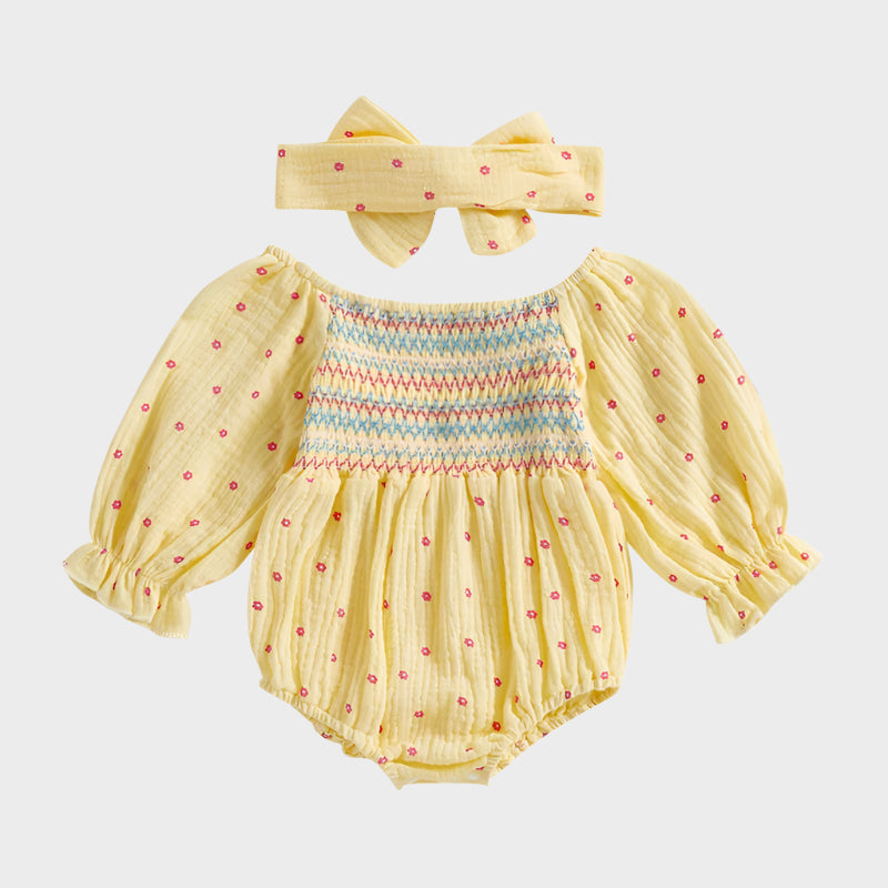 This bodysuit dress features a short puff sleeve, a square neck, and comes with a bow headband. Perfect for your little one to play and look stylish in. Made with high-quality materials for ultimate comfort and durability. Add a touch of cuteness to your child's wardrobe.