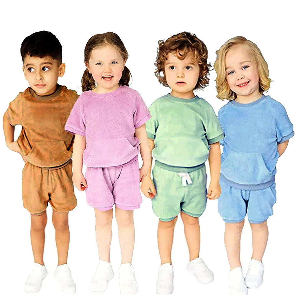 Keep your little ones cool and comfortable all summer long with these versatile terry cloth clothing sets. Designed for both boys and girls, each set features a soft, breathable t-shirt paired with matching shorts—perfect for playdates, outdoor adventures, or casual everyday wear. The gentle terry fabric is ideal for sensitive skin and provides excellent moisture-wicking to keep kids dry during warm weather activities. Mix and match pieces to create multiple outfits from one set. A practical, stylish addition to any child's summer wardrobe.