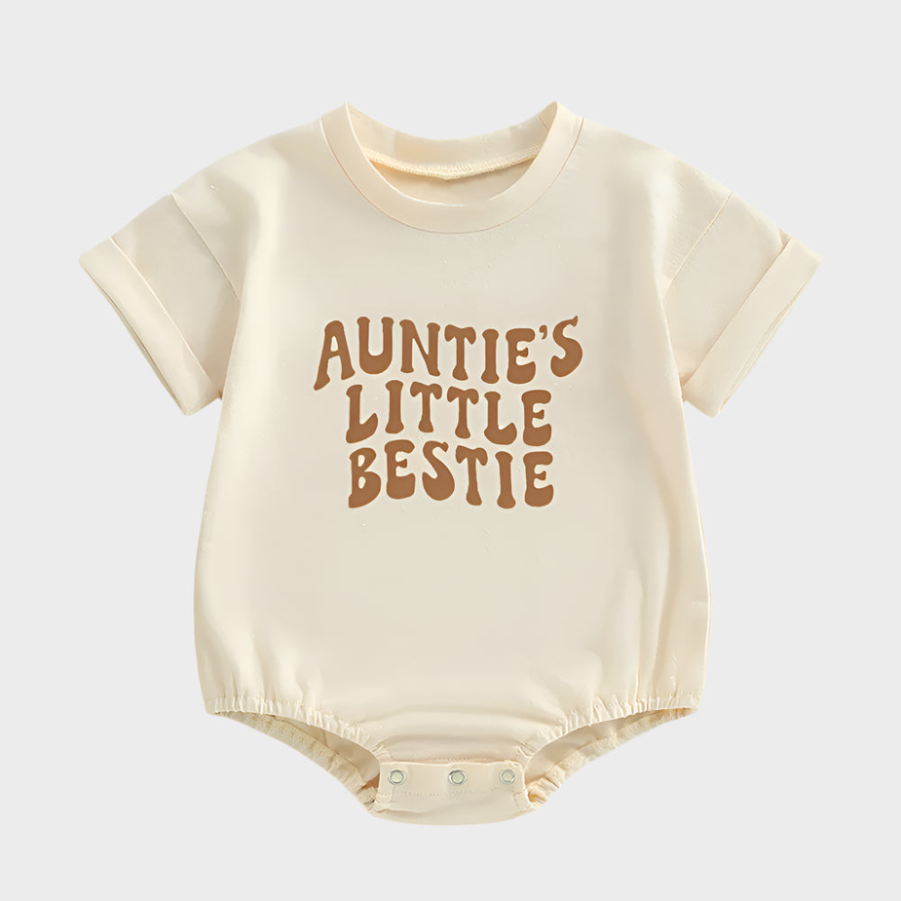 La combinaison à bulles Auntie's Little Bestie est la tenue parfaite pour que votre tout-petit puisse jouer et explorer. Fabriquée avec un tissu doux et de haute qualité et dotée d'un joli motif à bulles, elle gardera votre petite meilleure amie confortable et élégante. Montrez votre lien spécial avec cette adorable barboteuse.