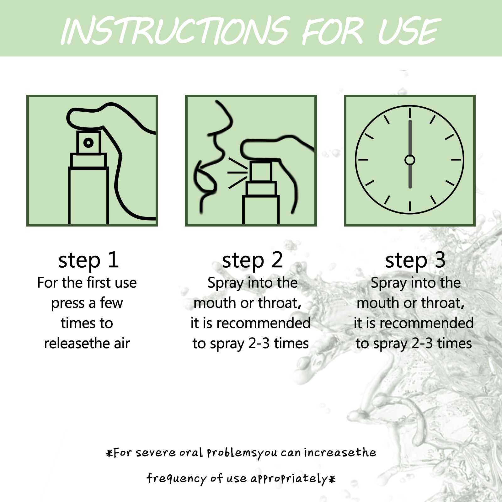 Our breath fresheners contain sorbitol, xylitol and menthol. It can remove and improve bad breath, odor, fresh breath, natural fragrance, lasting fresh. Its use is very simple: the first use of the press a few times to release air, spray into the mouth or throat, it is recommended to spray 2-3 times. Inhibit oral bacteria, not spicy, not dry, fresh breath, leaving fragrance and net taste, conditioning oral environment.