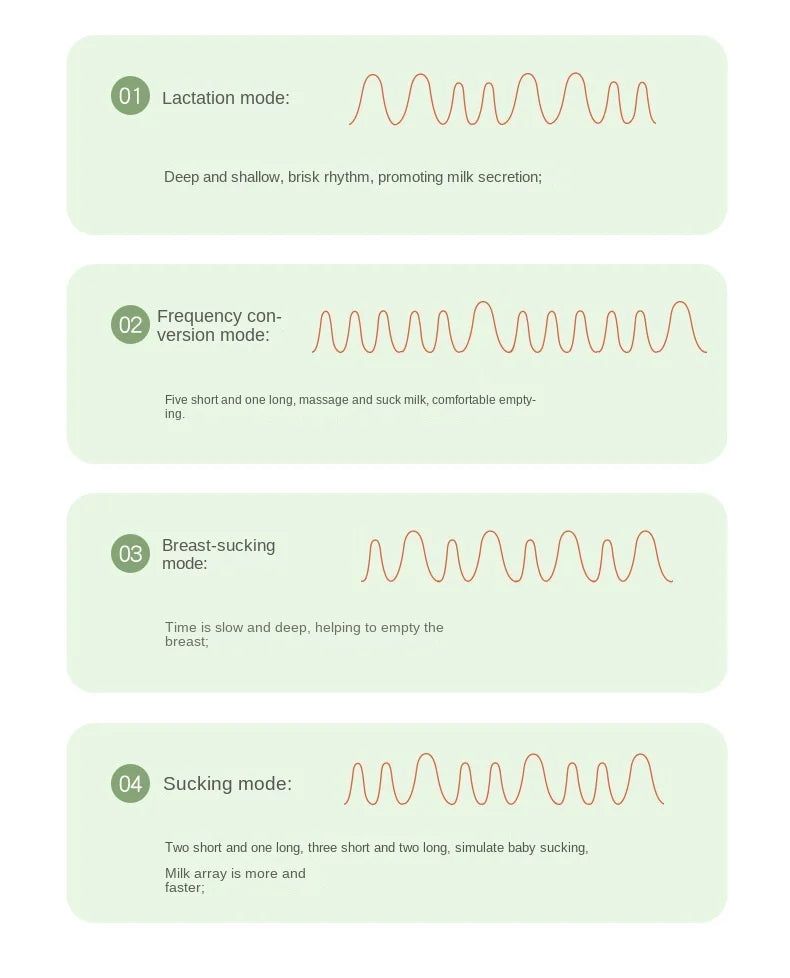 Ce tire-lait offre 4 modes (massage, aspiration, lactation et fréquence variable) avec 12 niveaux chacun pour 48 réglages personnalisés. Le mode massage augmente le débit de lait et aide en cas de mamelons plats ou inversés. Le mode aspiration imite le rythme naturel du bébé pour une extraction en profondeur. Le mode lactation utilise des impulsions pour augmenter la production de lait, tandis que la fréquence variable nettoie efficacement les conduits. Adapté à toutes les étapes, il favorise l'allaitement, améliore la production de lait et assure un pompage doux et efficace.