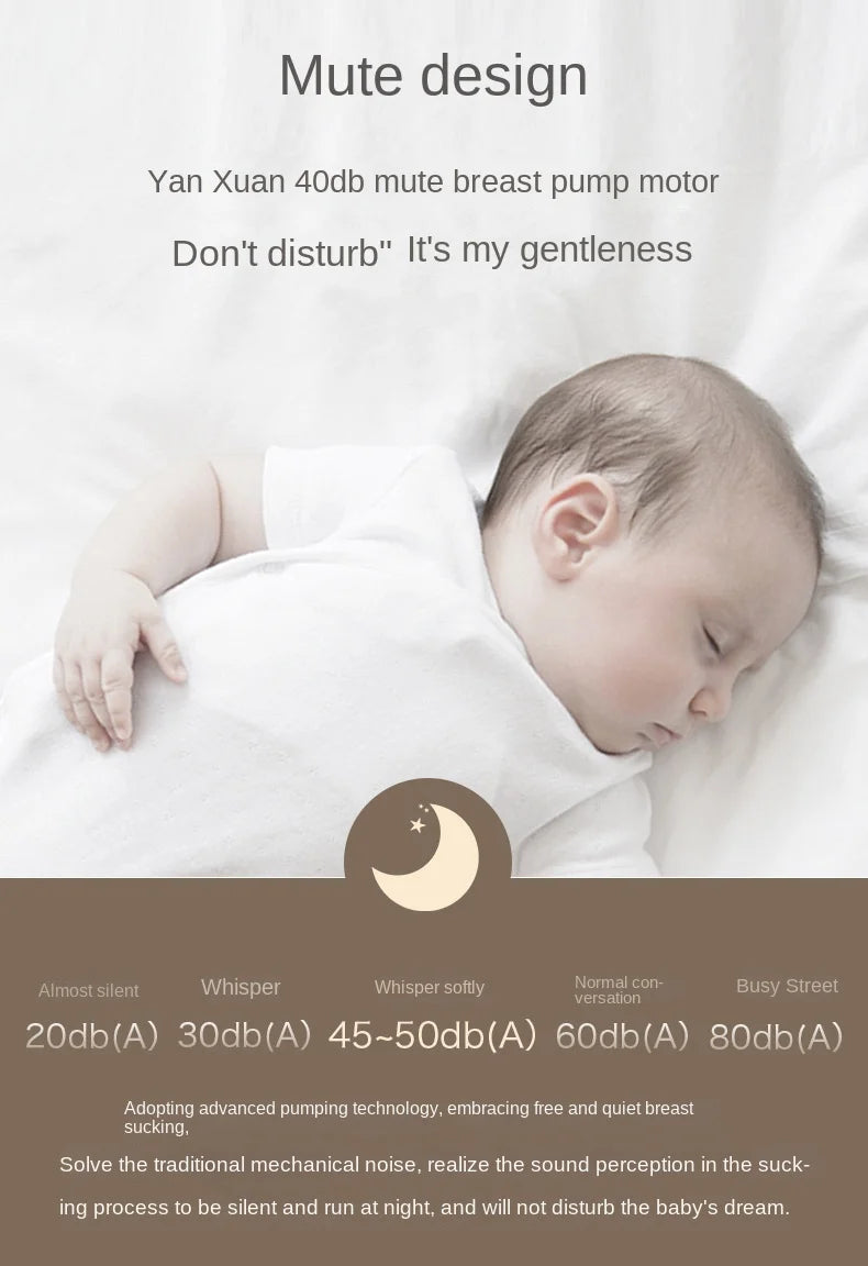 Faible bruitLe bruit de ce tire-lait électrique est inférieur à 40 dB lors de son utilisation et ne perturbera pas le sommeil du bébé. |