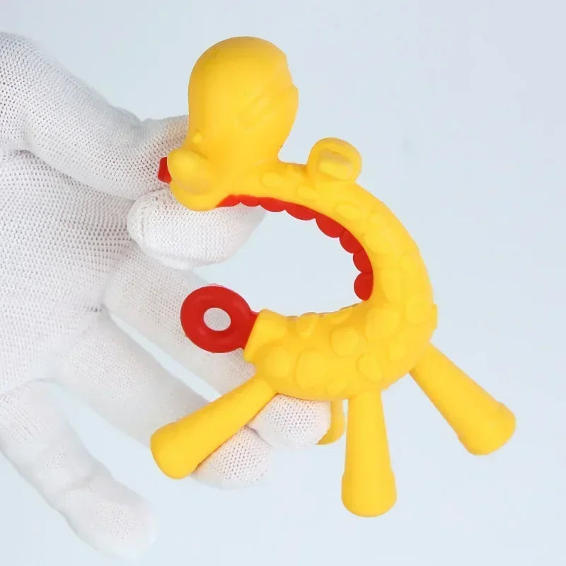 Introducing Giraffe Teething - the perfect solution for soothing your little one's teething pains. This teether features a cute giraffe and rabbit design that is sure to bring a smile to your baby's face. Made from safe and soft materials, it provides gentle relief for sore gums.
